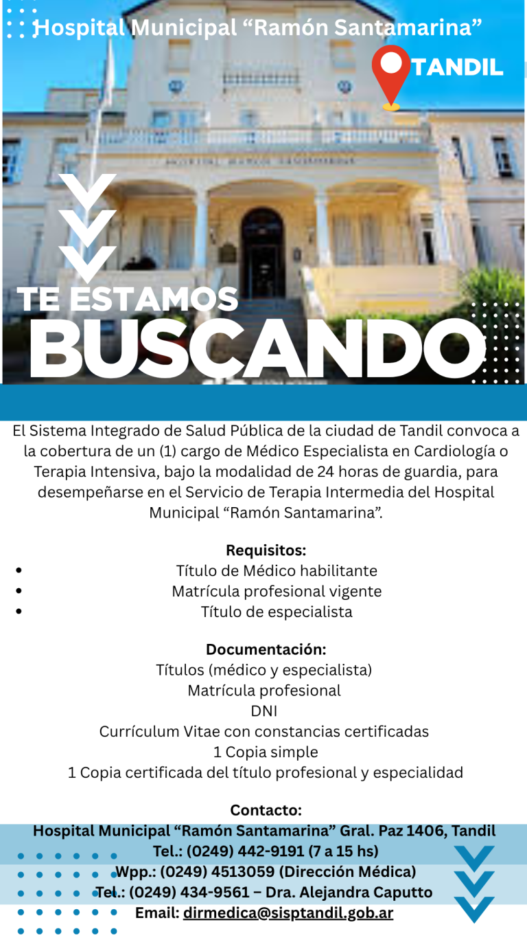 El Sistema Integrado de Salud Pública de la ciudad de Tandil convoca a la cobertura de un (1) cargo de Médico Especialista en Cardiología o Terapia Intensiva.
