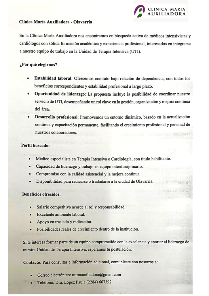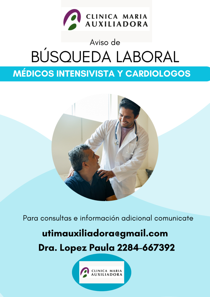 Búsqueda médicos Intensivistas y Cardiólogos Clínica M. Auxiliadora Olavarría